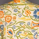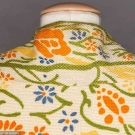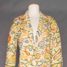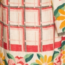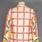 Both off-white: 1 basket weave cotton w/ orange, blue & green print, L 38", (fabric pull & collar stain); 1 linen w/ pink block grid & yellow & pink blossoms, L 36", (fading on shoulders) both very good.