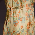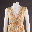 Beige silk w/ blue, orange & green print, 1-piece pajama, sleeveless, palazzo pants; 1 similar print open-front robe, B 32", W 30", H 36", Inseam 21", Robe L 55", excellent.