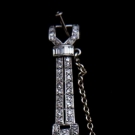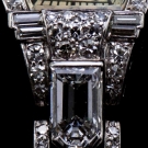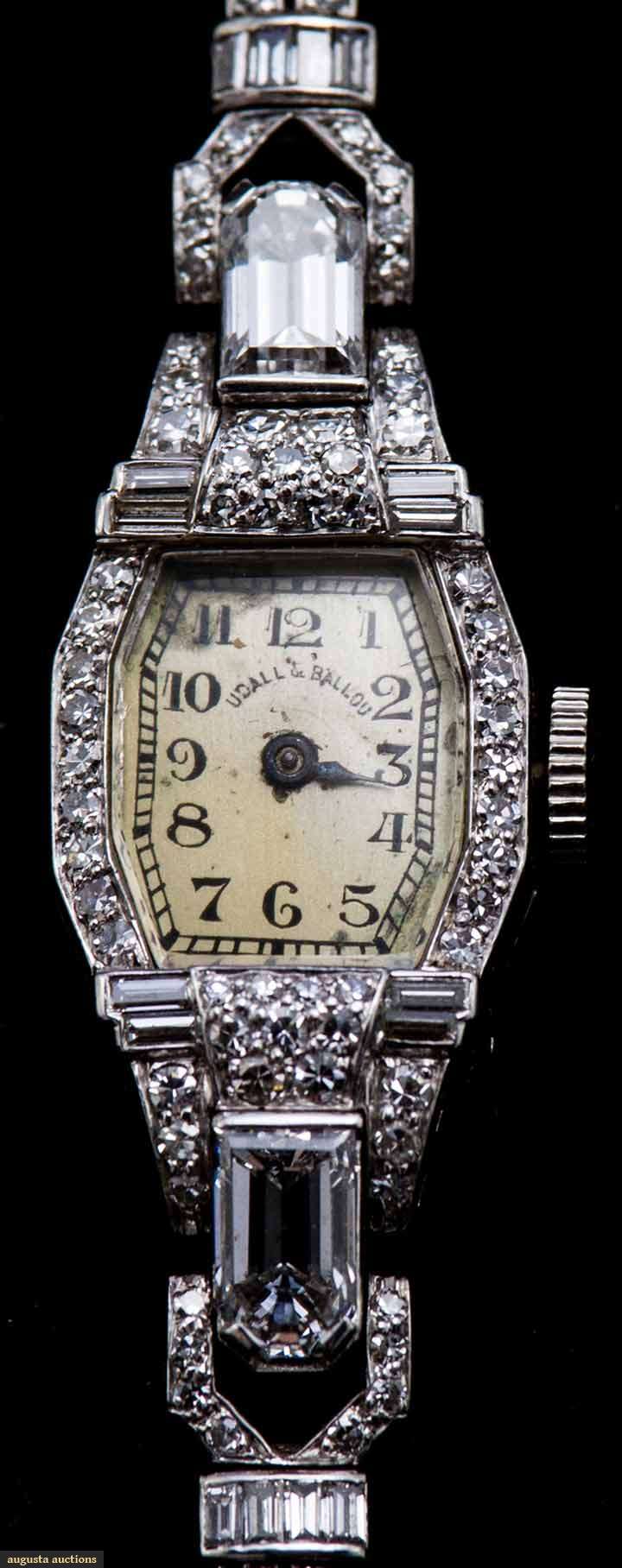 Small rectangular face w/ Arabic numerals, marked "Udall de Ballou", Touchon movement, Platinum face & band w/ 2 large bagettes at hinges of face & band, studded w/ smaller baguettes & tiny round diamonds, L 6", (face dirty, watch not working,1 hand missing) very good.