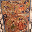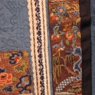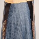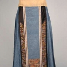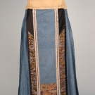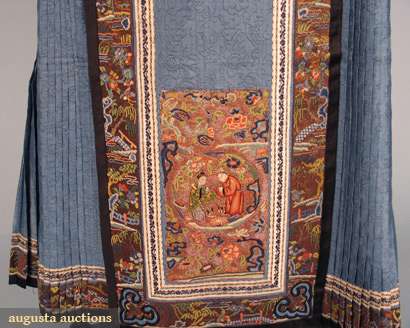 Blue silk damask, front & back w/ densely embroidered rectangular panels of couched gold threads interspersed w/ Peking knot flowers & 2 satin stitch figures, brown leno weave border w/ multi-color embroidery over gold foil, Skirt L 38", Waistband L 45",(stain at top of 1 center panel, minor silk loss on brocade silk ribbon) good.