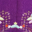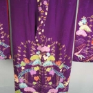 1 woman's kimono in deep purple w/ peach, green, aqua & lilac flowers, hem decorated w/ landscape scene in similar colors, red silk & multicolor stripe silk lining, L 61", Slv L 40.5"; 1 padded purple silk vest w/ ribbon & floral print in red & white tiedye lining, L 25", W 45", both excellent.