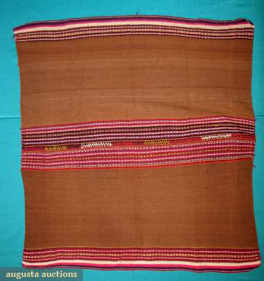 Finely woven by Sorata Indians of the Andes Mountains, pieced center & outer ends both w/ flat & raised weave narrow multi-colored bands on rich brown ground, 35.5" x 37", excellent.