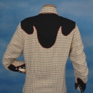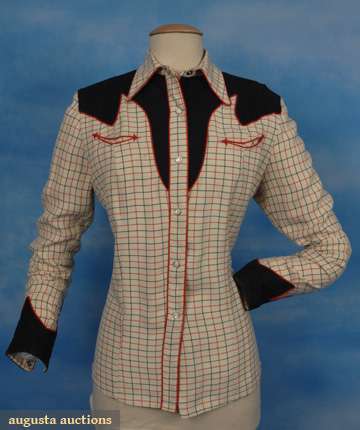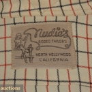 Cream wool w/ red & black windowpane check, contrasting contoured black yoke & cuffs w/ red piping, shotgun cuff, pearlized snaps, smile pockets w/ embroidered arrows, label "Nudie's RODEO TAILORS NORTH HOLLYWOOD CALIFORNIA" w/ naked cowgirl & lasso, customer label in shirt tail "Dora W.", N 14.5", B 38", Slv 23.5", (pocket arrows have bled slightly) otherwise excellent.