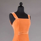 1 peach silk velvet, cloth flower trim, B 33", W 23", L 56" (couple light brown skirt stains); 1 beige taffeta w/ ruched midriff, B 36", H 38", L 45"-54" (holes made by CF paste pin, light stains) both fair.