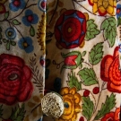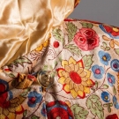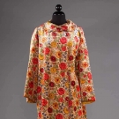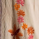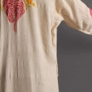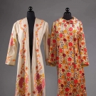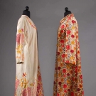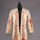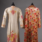 1 blush silk velvet w/ multi-color blossom print, L 49", (origial neck button missing) excellent; 1 Kashmiri white wool twill w/ crewel floral, bird & butterfly embroidery, L 51", (pilling & areas of fabric wear, missing belt) fair.
