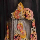 Drop waist, pleated skirt, cap sleeves, chain-stich embroidery w/ melons & foliage, L 48", (few small holes at hem) very good; t/w 1 black silk dress embroidered in stylized floral pattern w/ bronze thread & glass beads in turquoise, orange & gold, (large tears at back & at both underarms) & 1 sequin trimmed pink chiffon party dress (sleeves damaged & holes near hem) both fair.