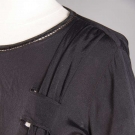 1 black silk velvet w/ tiny geometric print in rose & silver, matching sash, B 44", Drop W 42", excellent; 1 black silk faille, inset velvet low W band, (2 large mends above front W, 4 jet cuff buttons missing) fair.