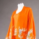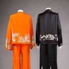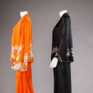 1 3-piece orange, B 38", W to 36", Inseam 26", (many scattered stains, tear hem pant leg, small holes) fair; 1 pair black & white w/ embroidered dragons, elastic W 36", Inseam 22", (pin holes on jacket, small red stains at leg hem) very good….