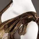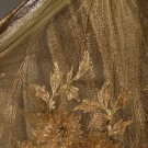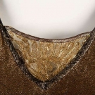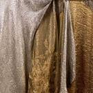 Alternating chevron pattern in silver & gold, side skirt gores of gold lace, B 34",  L 48 ", (shredded lining, lace insert at CF neck damaged, small holes to left side hem, minor tarnish) very good.