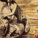 Silk twill w/ multi-color print, Christopher Columbus, Native Americans & animals in front of world map, design by "Kermit Oliver", 34" x 35", (round discolored area at center top edge) very good.