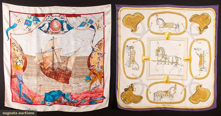 Both white silk twill, labeled & 35" x 35": 1 1992 "Christophe Colomb" in his boat designed by Carl de Parcevaux, excellent & 1 1962 "Grand Apparat" of horses & tack designed by Jacques Eudel, (stains) very good.