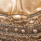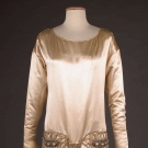 Worn by Vogue editor EILEEN CUMMING when she married Dr. Russel L. Cecil in 1923. Candlelight silk charmeuse, pearl & bead trimmed hip belt, labeled, B 36", Low W 34", L 55", Train CBL 74", (1 shoulder missing hook & eyes, underarm stains, light green stains on train, hem edges & 1 at left elbow, bead loss, lining shattered) fair. EILEEN CUMMING CECIL was editor at VOGUE in early 1920s.