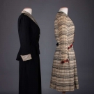Both 2-pc skirt suits: 1 black Rayon waffle weave w/ white striped collar, cuffs & striped buttons, label “Lora Lenox”, B 40”, W 30”, Skt L 32”, (stain at back neck, right collar & B, makeup stain inside collar) & 1 black plaid on cream wool, cr jacket w/ red & black cord trim, label “Jean Lelong, Paris”, B 38”, W 28”, Skt L 24”, (very tiny red stains at left neckline, skirt modified) both very good.