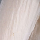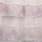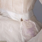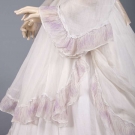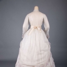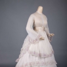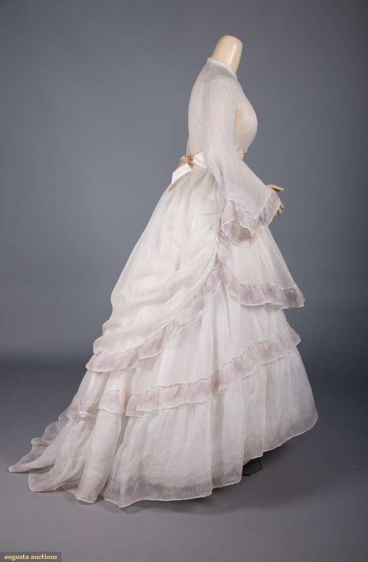 2-pc Polonaise bodice & skirt, pale lavender printed trim, bell sleeves, B 38", W 29", Skt L 38"- 53", (6 period mends, tear to overskirt W, cluster of tiny stains in 1 sleeve, missing hooks & sash, ribbon N/I) very good.