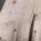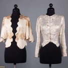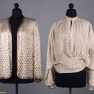 1 bolero w/ gold & silver lame & scalloped edges, L 20", (light stains throughout); 1 silver lame fitted jacket w/ small CF bows, B 36", W 26", L 20", (some tarnishing & stains); 1 silver lame w/ small beaded blossoms, L 27", (fold lines across back, tarnish at back neck, weak spots at right underarm & SH, bead loss); 1 silver lame blouse w/ deco patterned brocade, W 31", L 22", (opening missing hook & eye, tarnish left front sleeve) all fair.