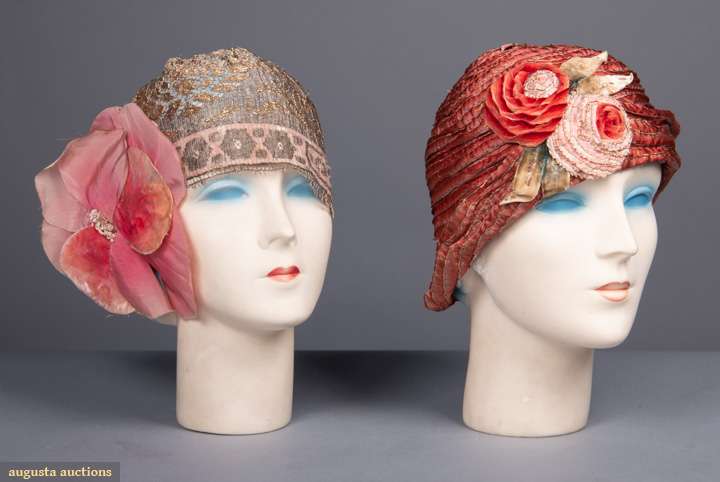 1 silver & gold lace w/ large side blossom, (some tarnish, small breaks at edge of cloche, some stains on flower); 1 fashioned from narrow ombre coral silk & lame ribbons, turn back brim w/ pair of ribbon blossoms, (ribbon separations, some tarnish glue residue on velvet leaves) both fair.