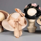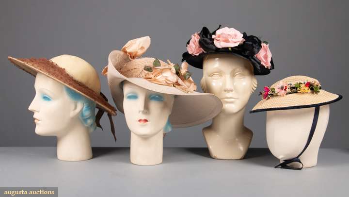 1 black w/ open crown, (pink flowers & ribbon later additions); 3 natural straw: 1 wide brimmed ivory straw w/ beige silk bows & roses, (dirty), 1 w/ dark brown net trim on brim & 1 young girls w/ navy velvet edging & colorful floral garland, all very good- excellent.