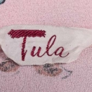 Light pink silk crepe w/ portraits of 19th C women & attached shoulder capelet, labeled "Tula", B 36", W 26", L 56", excellent.