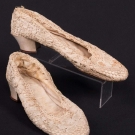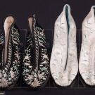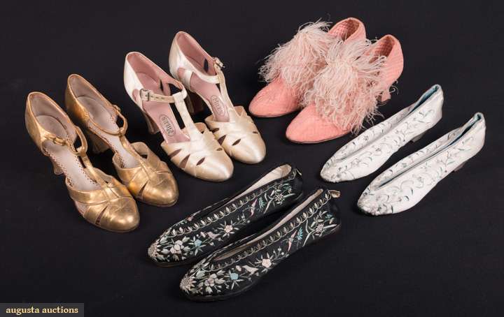 2 pair embroidered Chinese slippers: 1 black & 1 white, both excellent; 1 pair pink quilted & feather boudoir slippers, excellent; 2 pair evening t-straps w/ cutout vamps: 1 pair white satin, excellent & 1 pair gold kid, (few stains) very good; t/w 1 pair Irish crochet wedding shoes.