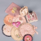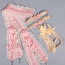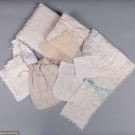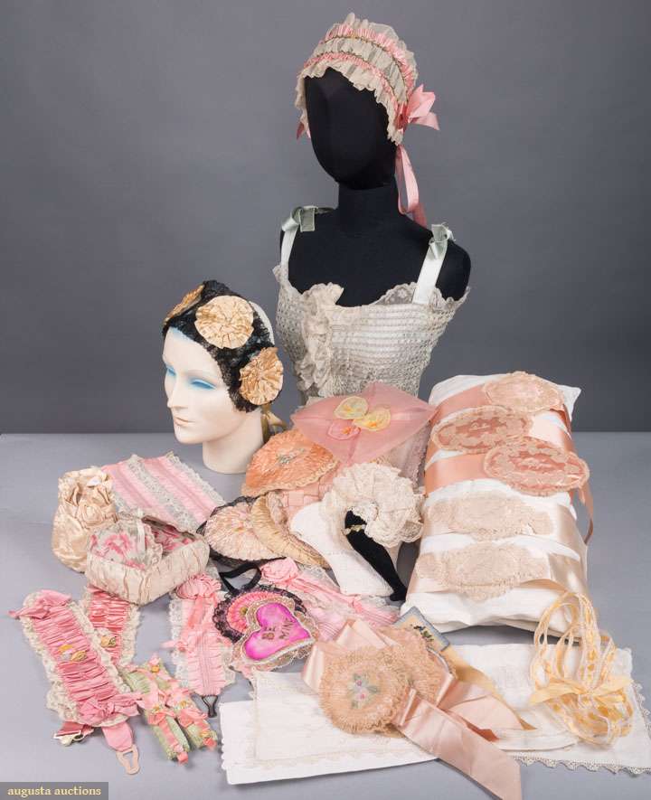 Most silk w/ ribbon flowers or lace, 10 lingerie bundle ribbons, one lace & ribbon camisol, B 34", W 26", L 16", (stain in back left ribbon); 2 headbands; 2 garters; hankies & sachets; various bags; (note: white display pillow not included)