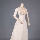 1 ivory silk faille, 2-piece, handmade Brussels lace neck flounce, B 34", W 21", Skt L 41"-43", (corroded pin marks at CF, stains in CF right, right side hem & right back), lace flounce later addition, fair; 1 emerald green leaf pattern silk brocade, trained bustle back skirt, MOP buttons, B 36", W 27", L 59-75", (underarm stains, sun fading, stain CF W & B, damage to CF hem, skirt modified), fair; t/w black chiffon ballgown skirt w/ sequin trim in starburst pattern