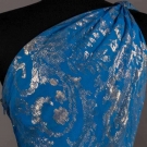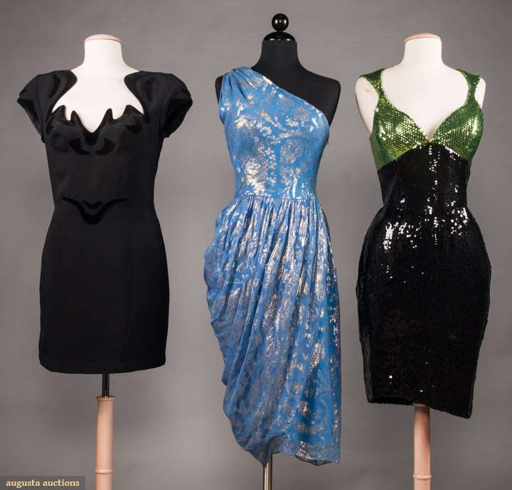 1 1960s Bill Blass blue w/ silver lame brocade, sarong style dress, B 36", W 26.5", L 44", (missing belt, small 0.5" stain in seat, large lining stains); 2 1990s labeled "Thierry Mugler, Paris": 1 black mini dress w/ velvet appliques & cut out neckline, B 38", W 31", L 34", excellent & 1 deadstock green & black color block sequined dress, B 38", W 30", L 37.5- 39.5", pristine.