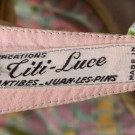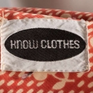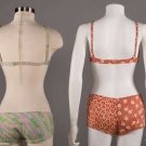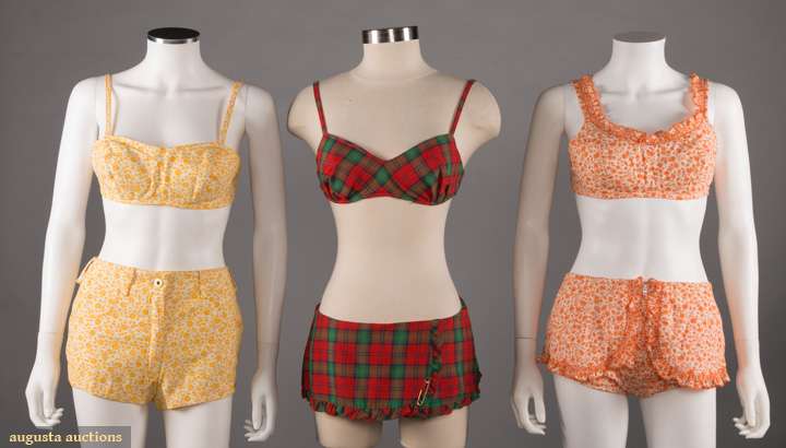 2 small prints on white cotton & label "Lady Bug": 1 yellow, B 36", W 25", H 33" & 1 ruffled orange, B 34", Low W 30"; 1 green & red plaid cotton, label "The Villager", B 35", Low W 34"; 1 rust on beige, label "Know Clothes", B 34", Low W 32", 1 triangle print in pastels, label "Citi Luce Made In France", B 36", Low W 34", H 36", all very good-excellent; t/w 1 blue & white child's bikini. Museum at FIT.