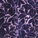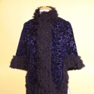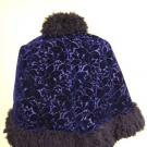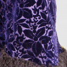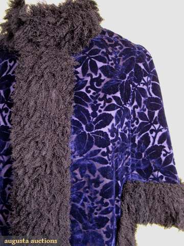 Royal purple silk velvet, lush florals cut to satin, perimeter trimmed w/ 4" band of midnight blue shredded & crimped silk, glazed ink blue cotton twill lining, Sh-Sh 14", Front L 29", Back L 20", (1 pea size worn spot to satin ground on back) otherwise excellent.
