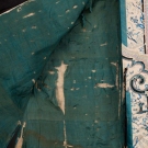 Embroidered silk Chinese winter robe in tones of navy, aquamarine & pale celadon, embroidered flowers throughout, trim w/ female figures & foliage, cuffs embroidered w/ butterflies & pink & blue flowers, Cuff-Cuff 60”, L 42”, (some thread loss, worn/ frayed at tie, cuffs, hem, left SH & back neck, 0.5” stain to back of left cuff) robe good, lining fair.