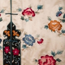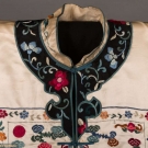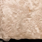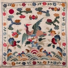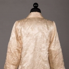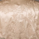 2 cream silk embroidered Chinese export garments: 1 coat w/ orange, red & blue floral embroidery, Fu bats, butterflies & CF & CB bird panels, Cuff-Cuff 52", L 43", (light stain at neck band, group of stains in left front, stains in right back sleeve, small smattering of stains in lap & small spot stains to collar bones) & 1 white on white embroidered jacket w/ garden & bird motif, single button closure, B 40", L 24", (1" stain at right front hem, hem tear in right front, pulls) both good.