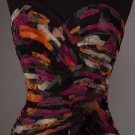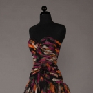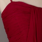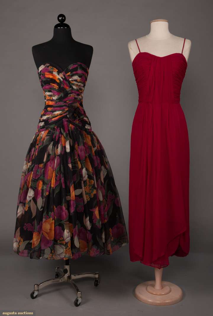 2 chiffon party dresses w/ fitted & pleated bodices & CB zipper: 1 1980s strapless floral print w/ sweetheart neckline & full skirt in orange & fuchsia floral on black ground, label "Saks", made in France, B 34", W 25", CF L 40", (white stains to left side of skirt) & 1 1960s crimson spaghetti strap w/ goddess drape, B 34", W 27", L 53", (pulls & tear at straps) both good.