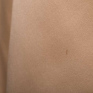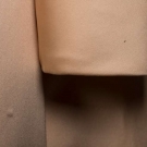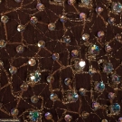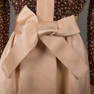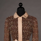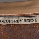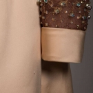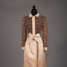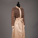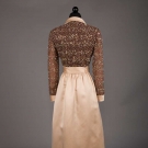 Late 1960s evening gown w/ cream satin skirt, peter pan collar, self belt & cuffs & brown silk chiffon bodice w/ all-over gold thread beading & rhinestones, label "Geoffrey Beene", B 34", W 24", L 52", (spot above both knees, smattering of stains to back left cuff) very good.
