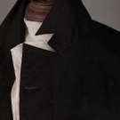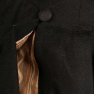 Black wool frock coat w/ pockets in tails lined w/ tan & brown wavy stripe cotton, & "M" notched collar, CH 40", L 21-37", (tiny white dots in CB, some moth holes, holes in lining) good.