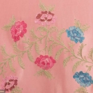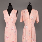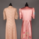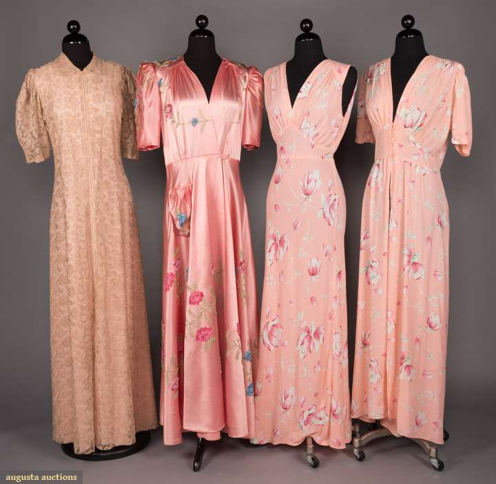 1 sleeveless nightgown w/ keyhole at CB & V-neck front w/ matching short sleeve robe in peach w/ pink dogwood motif, both label "Radcliffe", (seam off & cut at front V-neck) 1 short sleeve pink satin wrap front robe w/ right H pocket w/ floral embroidery, (mending at left B, stains in right sleeve, missing belt); 1 zip front robe w/ lace overlay, all B 36"-40", L 54"-59", all very good- good.