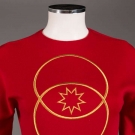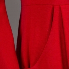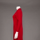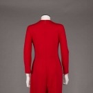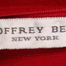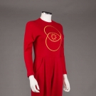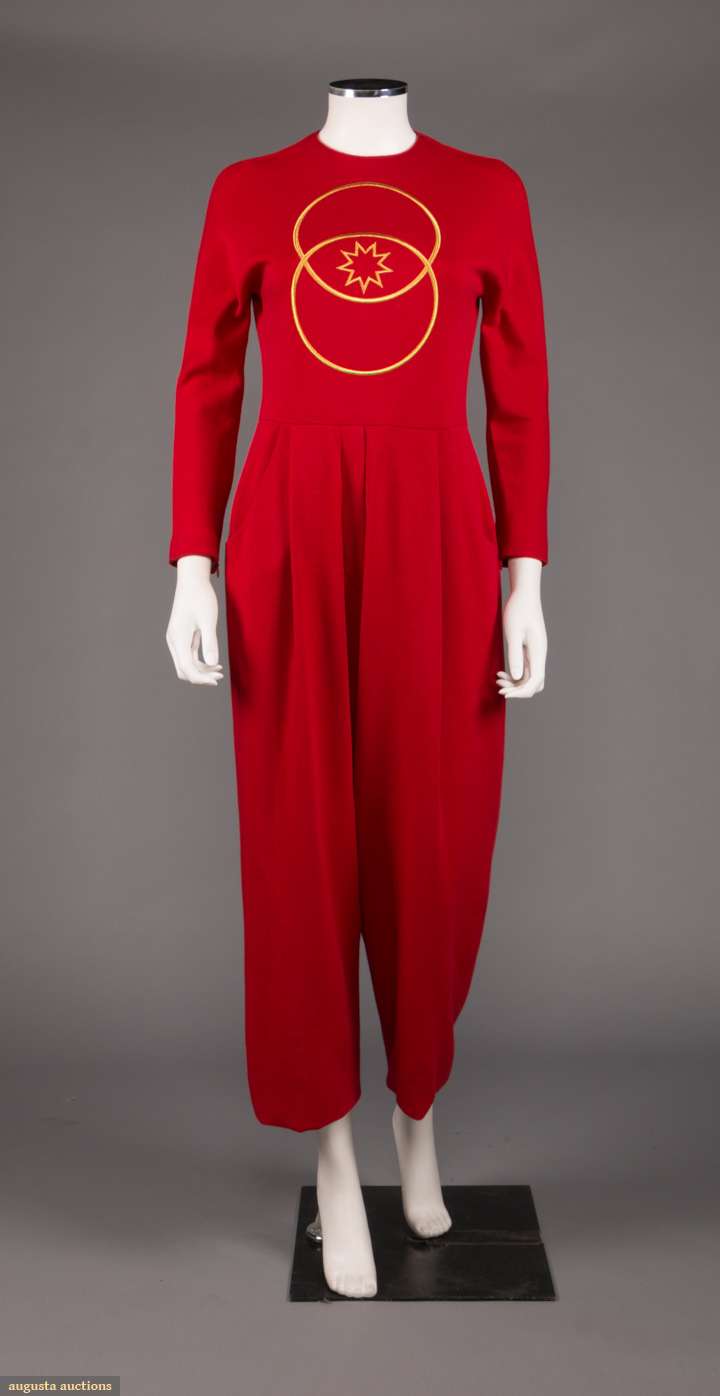 Red wool jersey jumpsuit w/ slash pockets at pleated W, long sleeves w/ zippers at inside cuff, CB zip closure, wide leg & interlocking ring & star embroidery in gold to chest, label "Geoffrey Beene", B 36", W 30", Ins 24", (embroidery not original) very good.