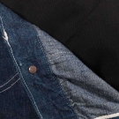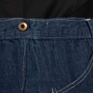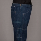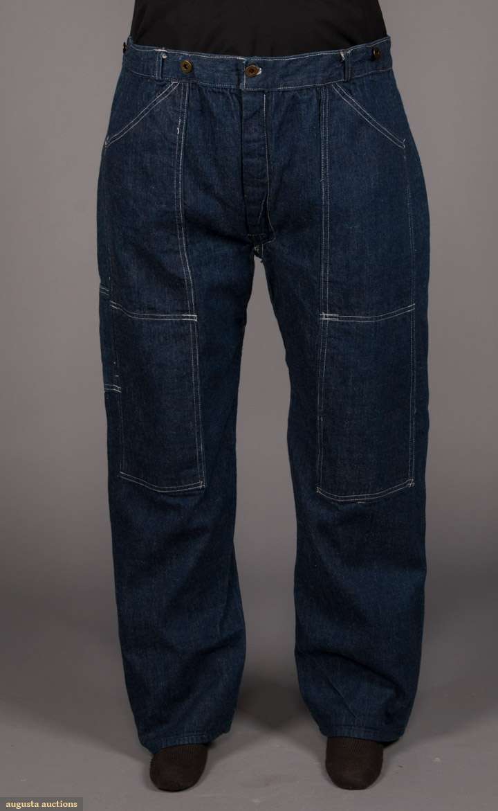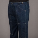 Pair of unbranded mans blue denim work jeans w/ reinforced knees, 2 patch pockets at front, 2 at back, 1 at right side knee & 1 small interior pocket at right front, six suspender buttons, 4 belt loops, adjustable W at CB, 6 rivets, 3 button fly w/ exterior top closure, W 42", Ins 28.5", (fold mark at right side leg) excellent.