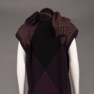 Wool 3/4 length cardigan in tri-tone purple geometric knit w/ caped sleeves across back to capped double weave sleeve underneath & ribbed infinity collar & cuffs, long sleeve convertible to scarf, "Issey Miyake", L CB 54", (few pulls) excellent.