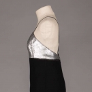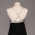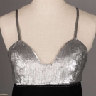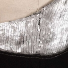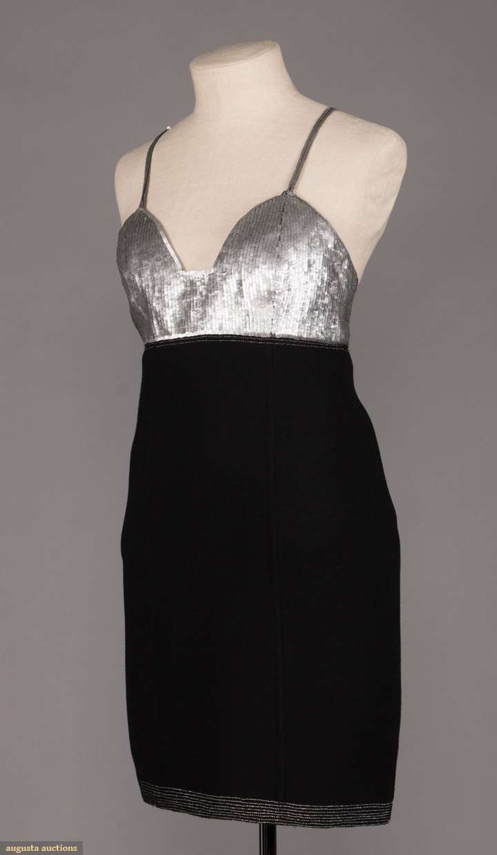 Early 1990s mini evening dress in black wool w/ silver sequined bodice & straps, silver accent threads below B & at hem, label "Geoffrey Beene", B 32", High W 26", H 35", L 32", (wear at back strap closure, sequins messy at underarms) excellent.