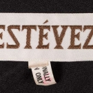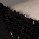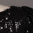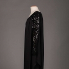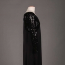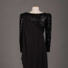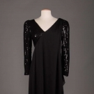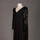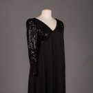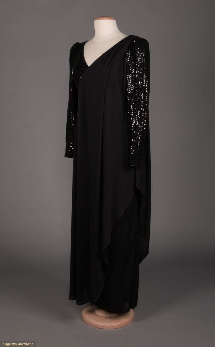 Black evening gown w/ sequined & capped long sleeves, classical asymetric right side draped panel, left ss slit & V-neck, late 1970s, label "Estevez", B 36", W 26", H 38", L 56", (sequin loss at back neck) very good.