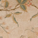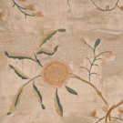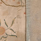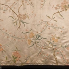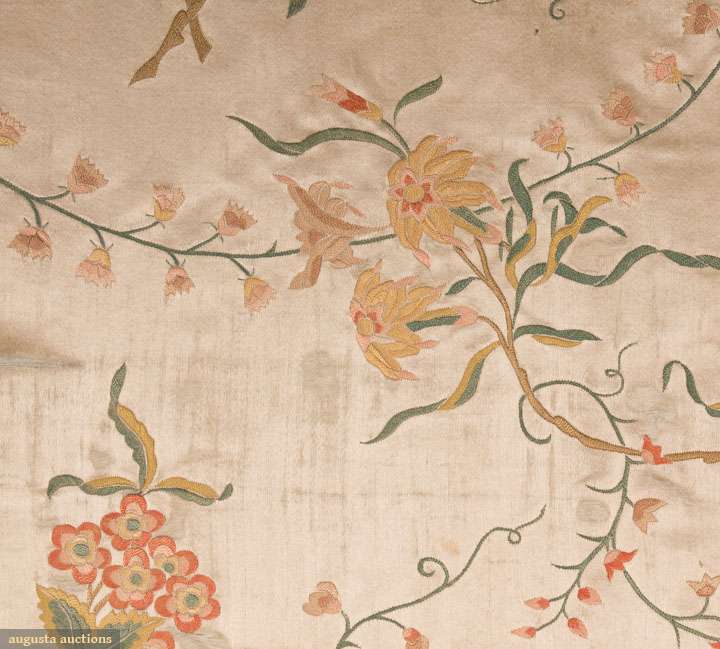 Pale Celadon silk bed covering embroidered w/ floral & vine motif in shades of greens, browns & pinks, repaired throughout w/ conservation stitching possibly in the 1930s w/ Rayon backing, c. 1750-1800, 65" x 76", (many areas of stress & up to 8"long breaks in fabric) fair.
