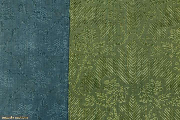 Green Spanish silk in ornament d'eglise motif, c. 1750, 2 pieces 39" x 20.25", (tide marks, some discoloration a 1 end); 2 pcs blue warp brocade drouget, French, 18th C, 50" x 39" & 20" x 20.75", (tide marks, discolorations throughout) both good - very good.