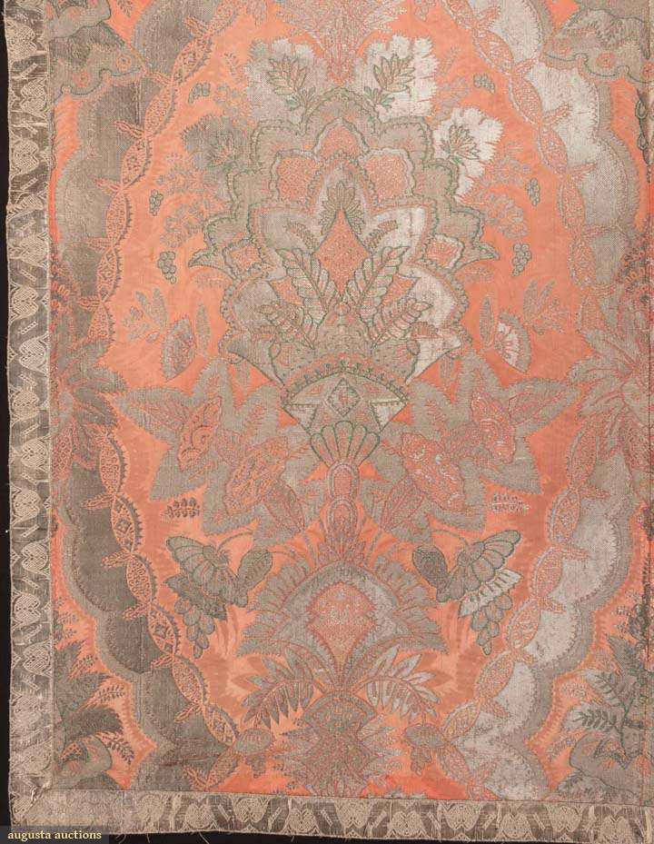 Peach & silver metallic brocade, WD 44", L 76", (areas of stress at 1 end, major repair across center, fades along fold lines) very good.