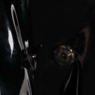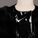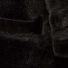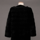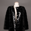 Black faux fur coat w/ vinyl collar, CF snap closure & pocket tabs, c. 1964-74, label "Pierre Cardin, New York", B 32", L 38", (snaps coming off) excellent.