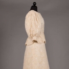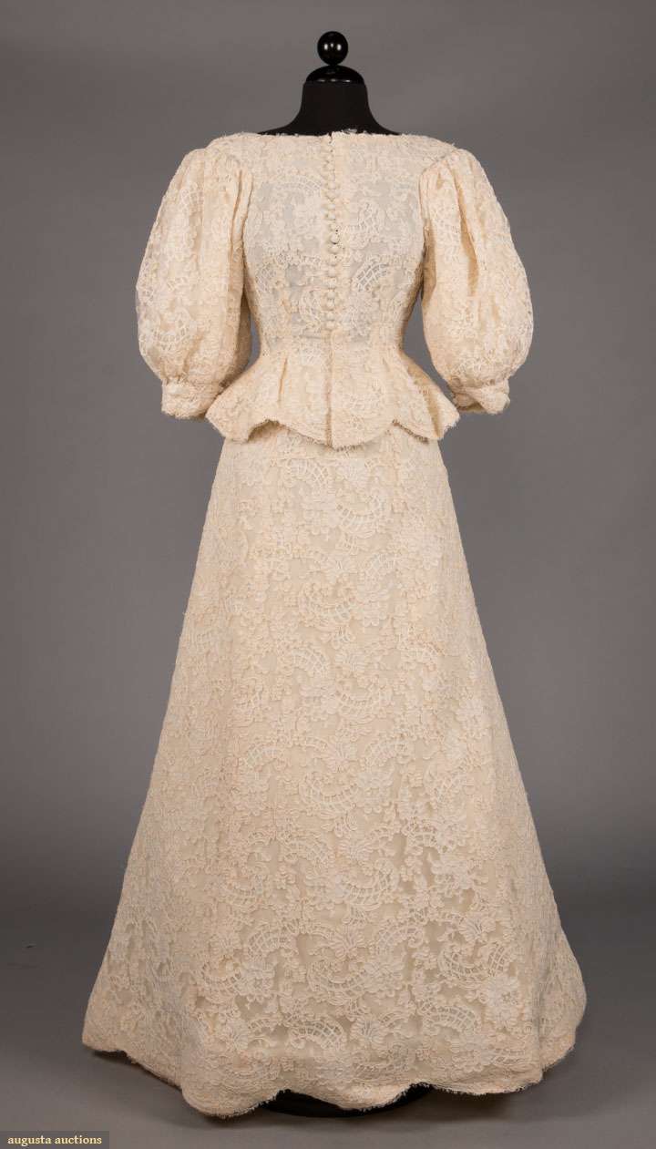 2-pc cream semi-sheer lace over organdy wedding gown w/ boat neck, button up bodice, puffed 3/4 length sleeves & peplum, scalloped bell skirt w/ train, label "Pauline Trigere", B 36", W 24", Top L 21", Skirt L 44-49", (stains at skirt hem & light stains on right front collar) very good.