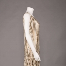 White & gold sequin on net 1920s evening dress in chevron motif w/ flared hem, B 34", W 25", H 34", L 44", (rows of missing sequins especially at B up to 10" long) good.