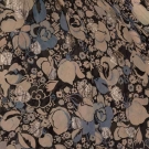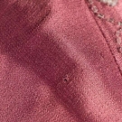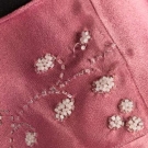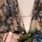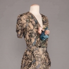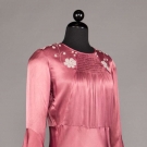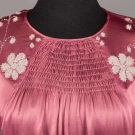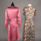 1 dusty rose long sleeve charmeuse dress w/ smocking & white floral beaded at CF collar, keyhole closure at back neck & bishop sleeves, B 34", W 30", L 43"(small holes at back right SH, bead loss/thread pull, pull at right lap); 1 chiffon in black & periwinkle floral w/ brocaded silver threads, short capped sleeves, V-neck w/ floral bunch, winged & darted pockets at front Hs, B 36", W 30", L 52.5"-54", (green fugitive dye to front of skirt & esp at left knee & B, slip N/I) both good.
