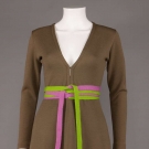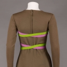 Olive green wool mini dress w/ green & violet self wrap belt & side seam H pockets, AW 1968, as seen on pg. 176 of "The Rudi Gernreich Book", label "Rudi Gernreich for Harmon", B 34"W 26", L 34", excellent.