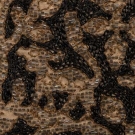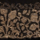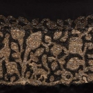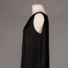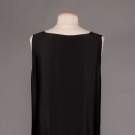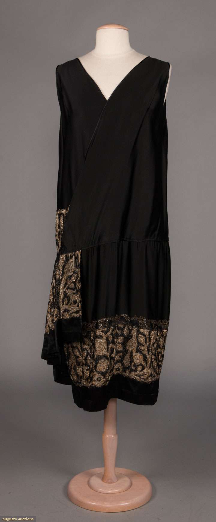 Black silk satin sleeveless evening dress w/ crossed B to wrapped hem embellished in silver beads w/ gold & black embroidery on cream ground in style of 18th C Italian lace w/ motif of floral & fauna, gathered detail below right H, label "Philippe & Gaston, Paris", B 38", L 48", (bead loss) very good- excellent.