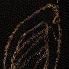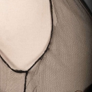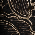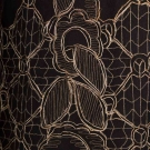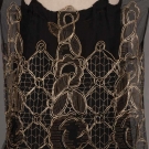 Black net sleeveless evening gown w/ gold embroidered in Art Deco floral motif, low W, flared skirt, B 32", L 48", (tarnish near B, rip & repair to net at SH, SH seam & right underarm separation, slip taken up 13", slip possibly not original) good.