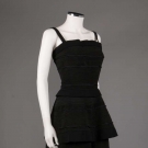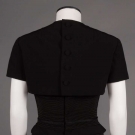 Black wool & silk blend & Ottoman 1950s evening dress, structured boned bodice w/ spaghetti straps & CB zipper closure, flared skirt w/ built in crinoline & matching bolero w/ CB self-button closure, label "Galanos", B 32", W 24", L 42", Bolero B 36", (hem falling on slip) excellent.